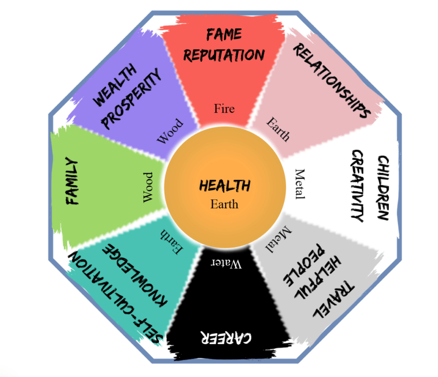 The center of the home is for health and considered the earth element, supported by the colors yellow and brown, with square shapes.